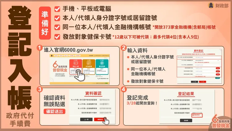五種管道中,最快的是登記入帳,3/22上午8時起開放,只要進入網址(https://6000.gov.tw),透過手機、平板或者電腦上網填寫必要資料,免讀卡機、免插卡,登記資料經系統核驗無誤,待特別預算三讀通過、公告生效後,6000元就會自動入帳到指定的本人金融帳戶。