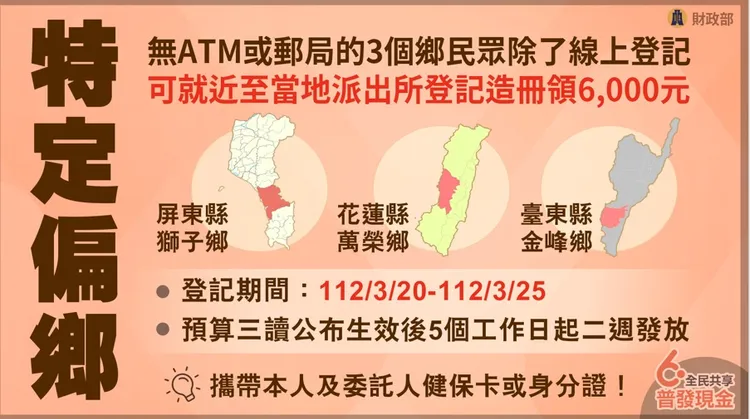 特定偏鄉若無ATM和郵局,除線上登記也可就近到當地派出所登記造冊領6000元。