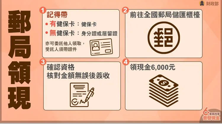 至於郵局領現,記得帶健保卡,若無健保卡則帶身分證或居留證,也可委託他人領取,受託人須帶證件,由郵局櫃檯確認資格核對金額無誤,簽收後就可領錢。