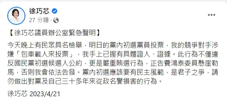 徐巧芯聲明全文: