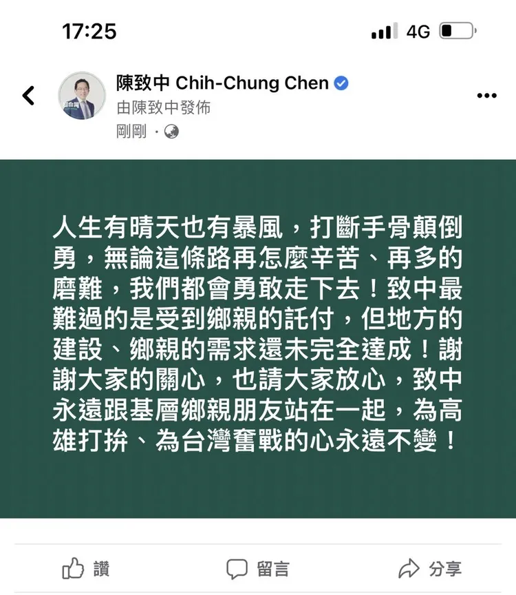 陳致中隨後才在臉書上聲明「人生有晴天也有暴風,打斷手骨顛倒勇,無論這條路再怎麼辛苦、再多的磨難,我們都會勇敢走下去!致中最難過的是受到鄉親的託付,但地方的建設、鄉親的需求還未完全達成!謝謝大家的關心,也請大家放心,致中永遠跟基層鄉親朋友站在一起,為高雄打拚、為台灣奮戰的心永遠不變!」