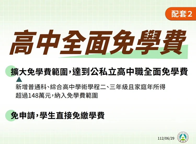 此外,這次方案也擴大高中職全免學費的範圍,新增納入普通科、綜合高中學術學程二、三年級且家庭年所得超過148萬元的學生,達到公私立高中職全面免學費。