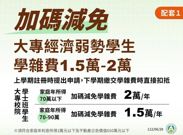 教育部表示,除了針對原先家庭年所得在70萬元以下的學生,定額減免學雜費2萬元外,也增加了家庭年所得70-90萬元這個級距,定額減免學雜費1.5萬元,不僅加碼減免金額,更擴大家庭年所得的補助級距,進一步強化對經濟弱勢學生的照顧。