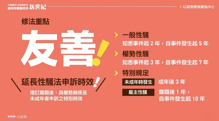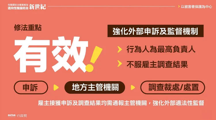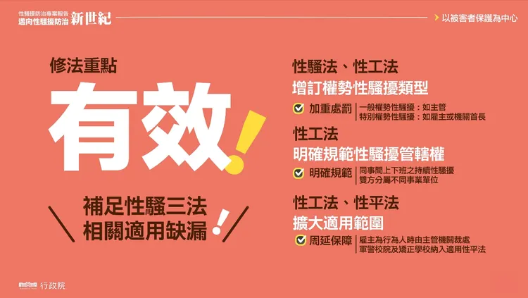 針對性平三法修正重點,行政院也提出3大部分:強化「有效」打擊加害人的裁罰處置、完備「友善」被害人的權益保障及服務、建立專業「可信賴」的性騷擾防治制度。