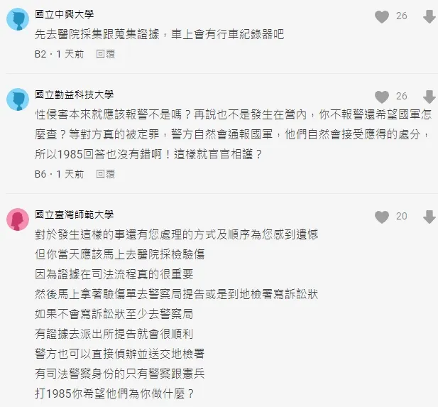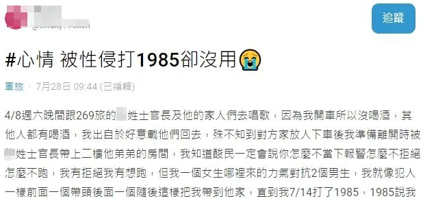 當事女子在昨日在社群發文,痛訴4/8晚間跟269旅某士官長及他的家人們去唱歌,由於她沒喝酒,出於好意就幫忙開車載士官長等人回家,沒想到放他們下車準備離開時,她一名弱女子遭士官長跟弟弟2壯漢強拉上樓性交、口交得逞,由於事發後她真的很害怕,過了3個月直到本月中才鼓起勇氣撥打國防部「1985諮詢服務專線」。