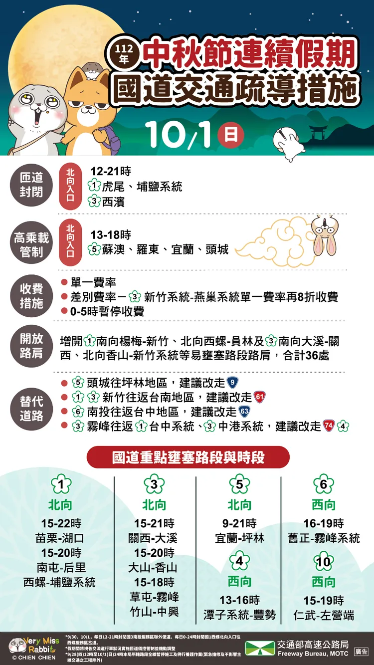 明日國道相關疏導措施包括:12-21時封閉國1虎尾、埔鹽系統及國3西濱北向入口、13-18時國5 蘇澳、羅東、宜蘭及頭城之北向入口高乘載管制、單一費率、0-5時暫停收費、開放路肩、替代道路、匝道儀控等。