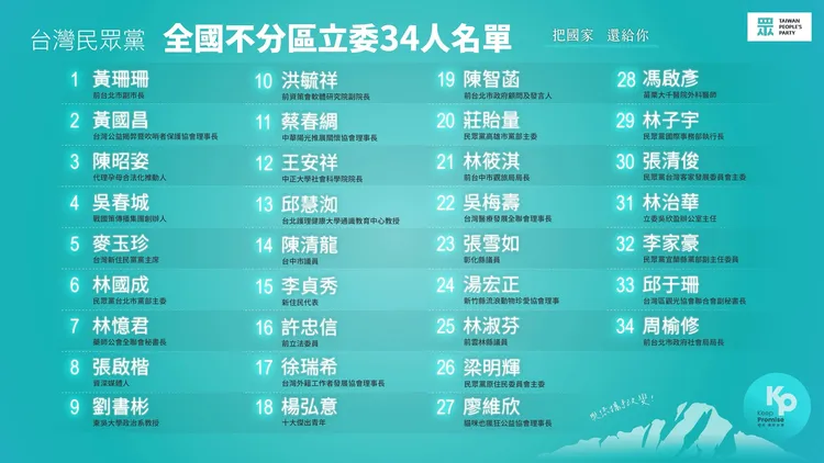 民眾黨今宣布調整過後的34位完整名單,前十名包括黃珊珊、黃國昌、陳昭姿、吳春城、麥玉珍、林國成、林憶君、張啟楷、劉書彬、洪毓祥。