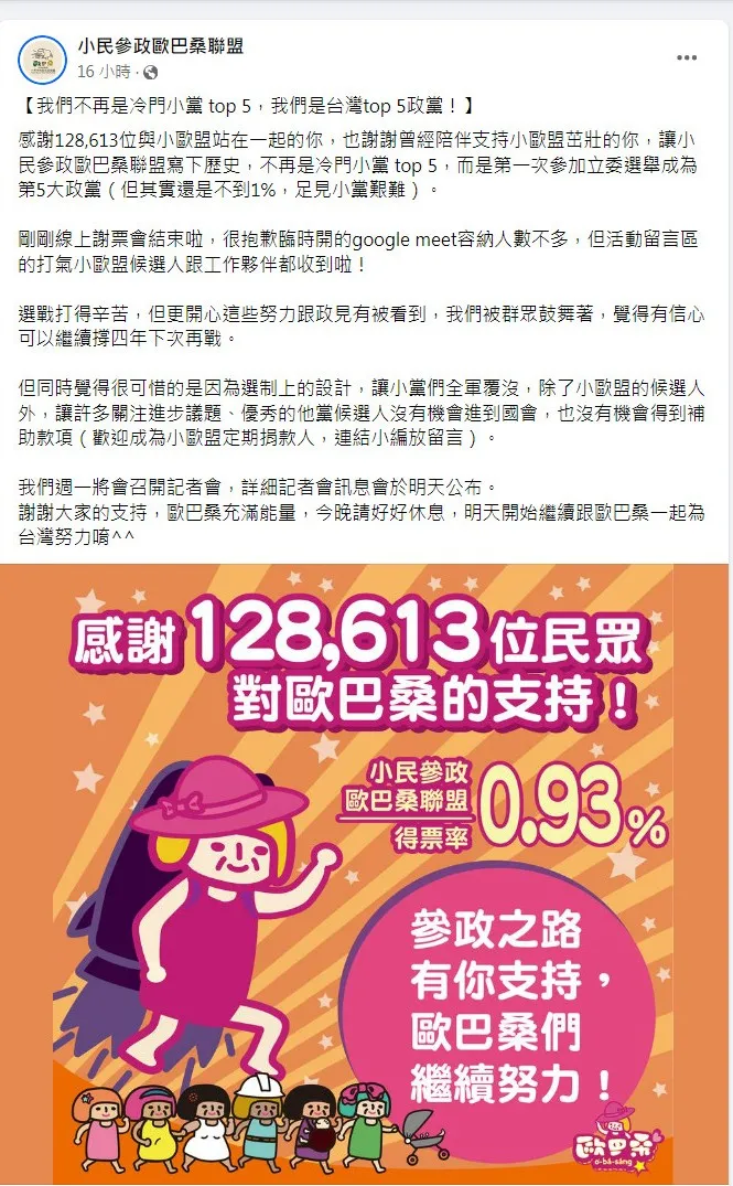 小歐盟在粉專上寫道:「感謝128,613位與小歐盟站在一起的你,也謝謝曾經陪伴支持小歐盟茁壯的你,讓小民參政歐巴桑聯盟寫下歷史,不再是冷門小黨 top 5,而是第一次參加立委選舉成為第5大政黨(但其實還是不到1%,足見小黨艱難)。選戰打得辛苦,但更開心這些努力跟政見有被看到,我們被群眾鼓舞著,覺得有信心可以繼續撐四年下次再戰。」