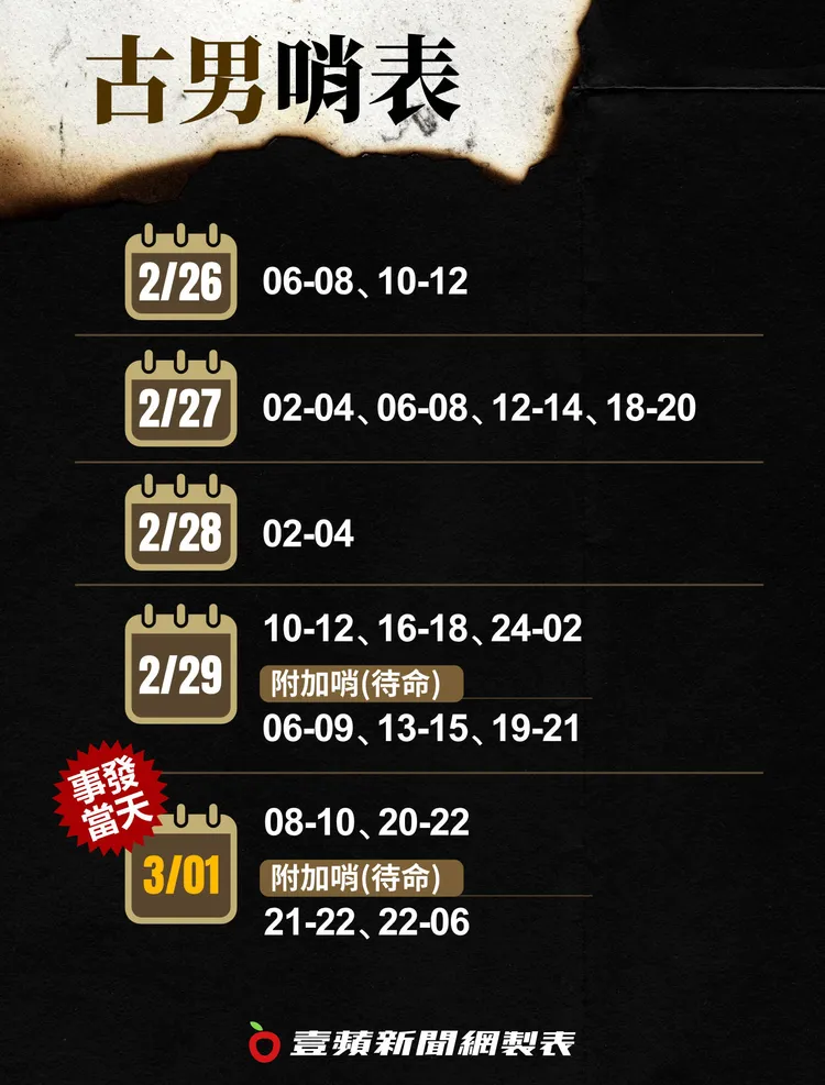 針對憲指部稱「站二歇二」非常態的說法,記者整理2月26日、2月27日、和事發後3月15日的內部哨表,其中在2月26日當天,除了古男,至少還有5位士官兵站二歇二,其中包括魏姓二兵、侯姓一兵甚至還站4班哨,晚間22時站到24時後,休息4小時就繼續站凌晨04時至06時的哨。