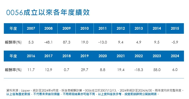 0056已成立超過16年,歷經多次市場多空考驗,除2008年、2010年的配息是累積至次年度發放,2011年至2024年已進入第14年連續配息且填息,提供長期投資人具持續性的收益回報。