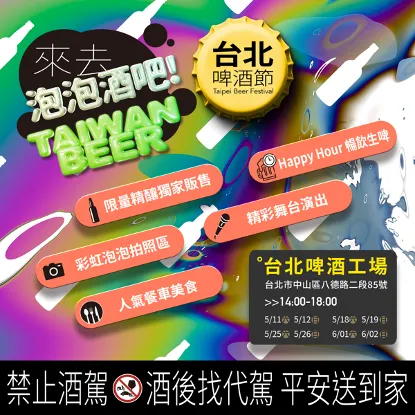 活動現場除販售最受歡迎的現壓生啤酒外,台北啤酒工場發揮百年傳承的工藝,特別釀製「金牌艾爾」、「迷霧協奏曲」、「愛戀紅寶石」、「DIPA」、「DIPA-TRIPLE」及「德式小麥」等6款北啤限量精釀啤酒,另特別設置「台酒限定」攤位販售烤香腸及酒廠特調酒款,5月至6/2的每週六、日14:30至16:30時段規劃了Happy Hour,只要199元便可以享受18天生啤酒喝到飽,此活動為每日限時限額。