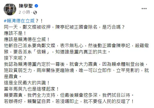 陳學聖指出,賴清德斬自己派系要角鄭文燦表示無私心,然後動正國會陳亭妃殺雞儆猴,他寫道:「要各派系『信賴』,知道誰是黨內真正的共主。」