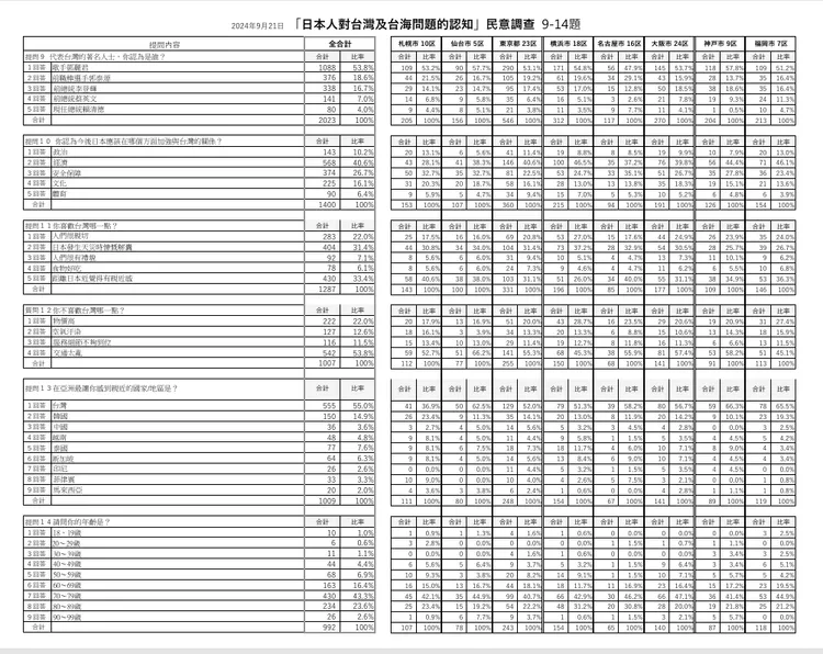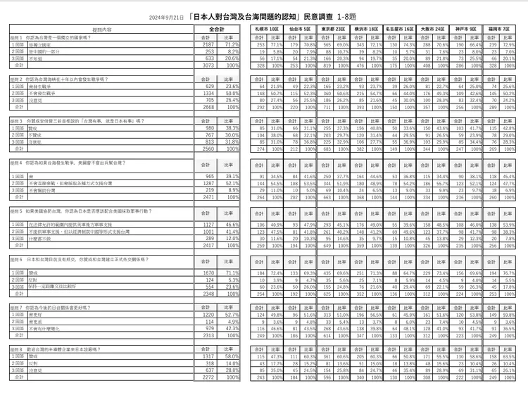 民意調查日期為2024年9月21日,對象是日本東京都、大阪府、札幌市、仙台市、橫濱市、名古屋市、神戶市、福岡市8大主要城市、18歲以上一般民眾,有效人數3000人以上。實施方式:座機電話;共14題,單選。此份針對台灣及台海局勢所做的民意調查,結果顯示日本民眾對於台灣及相關議題的高度關注和多元觀點。