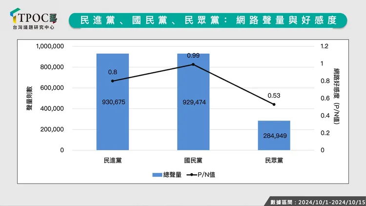總體而言,在調查期間內,民進黨總聲量超過93萬則居冠,國民黨則以總聲量92.9萬則緊追在後,此外,網路好感度方面,國民黨好感度奪冠,數值為0.99,透過國民黨的正面聲量熱門文章分析原因,國民黨得力於藍營大咖在國慶期間的發言、謝國樑順利挺過罷免案等事件,使藍營支持者們大感振奮,穩坐好感度冠軍。而民進黨的熱門話題內容種類多元,包括前總統蔡英文親自發聲「啟程訪歐」,喊話持續深化台歐關係,以及立委黃捷入選《時代》次世代百大人物等,都引來正面迴響,使其的網路好感度約為0.8居次。至於民眾黨,總聲量約28.4萬則,好感度僅0.53,無論是曝光度或者好感度,均大幅度遜於藍綠陣營。