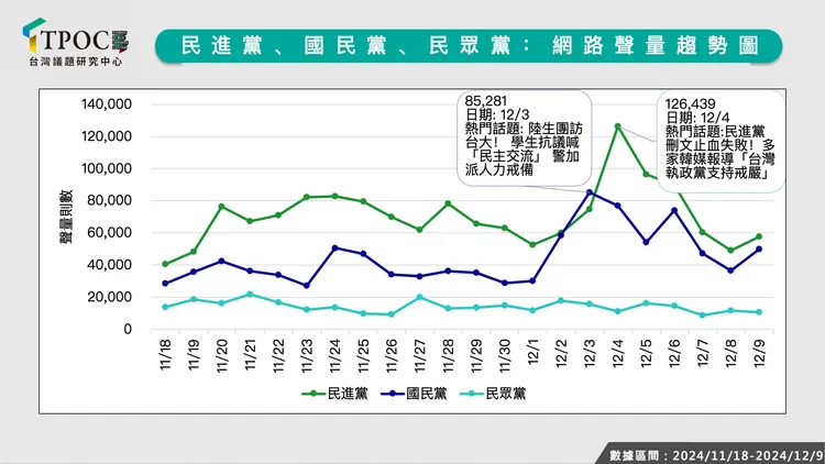 觀察各黨聲量走勢,首先,國民黨聲量高峰出現在12月3日,當日聲量8.5萬則,其熱門話題為前總統馬英九邀請馬龍與陸生訪團來台,但因陸生受訪時脫口「中國台北隊」獲得世界冠軍引發爭議,並在參訪台大時遇學生舉牌抗議,單日創下8.5萬則聲量高峰。而民進黨的聲量高峰則出現在4日,當日熱門話題為尹錫悅宣布戒嚴的第一時間,民進黨團小編的發文遭疑「挺戒嚴」,甚至被多國媒體轉載報導,當天引來超過12.6萬則聲量,也是調查期間內聲量高峰;至於民眾黨聲量表現平平,並無特別突出的話題和明顯聲量高峰。