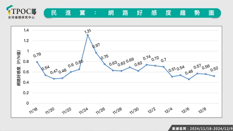 在網路好感度方面,國民黨在調查期間內好感度為0.7,負面聲量超過14.3萬則,亦有約9.9萬則正面聲量;民進黨好感度約0.63,略遜於國民黨,負面聲量達23萬則,正面聲量約14.5萬則左右,觀察民進黨的熱門負面貼文,除了黨團小編「發文挺戒嚴」爭議外,11月延燒至今的勞動部職場霸凌案也頗受關注,更讓在野黨形同「撿到槍」狂轟猛炸,PTT等網路論壇也頻頻「爆文」掀起大量討論。
