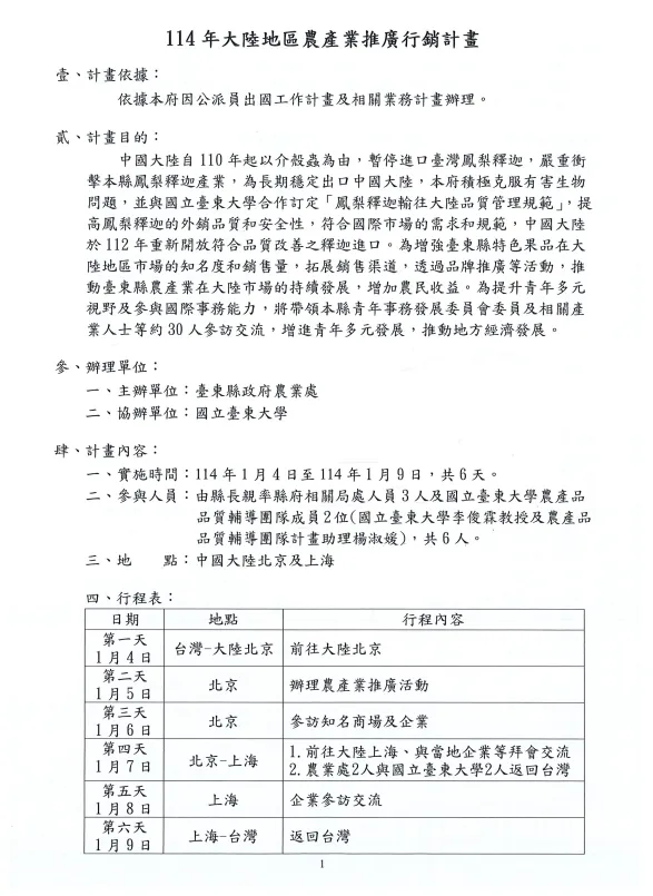 計劃書指出,饒慶鈴縣長將帶領「台東縣青年事務發展委員會」委員及相關產業人士約30日登陸,主要目的在於推廣農產品、多元行銷通路、增進青年多元發展等。