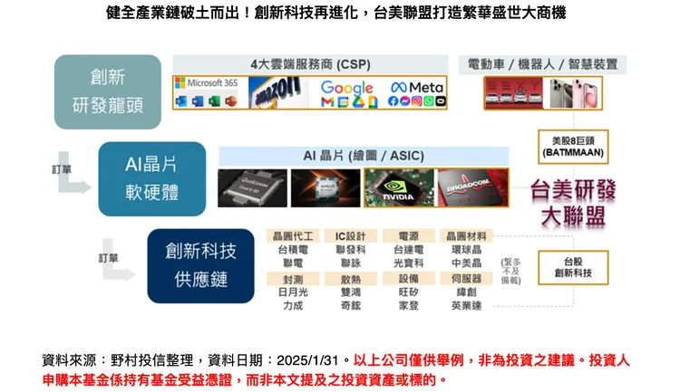 從長遠來看,全球AI競爭加劇將加速技術普及,帶動AI產業鏈的整體成長。台灣作為全球半導體與AI供應鏈的重要一環,相關產業如晶圓代工、IC設計、封測、散熱與電源管理等領域都將持續受惠。