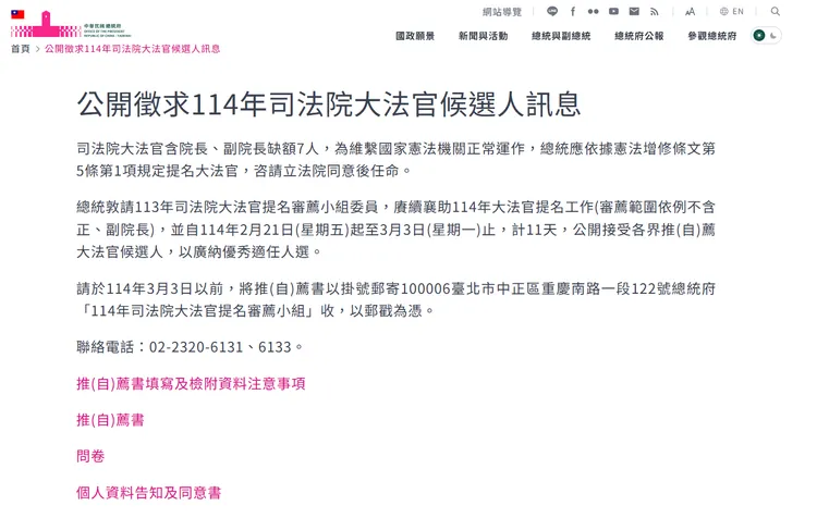 有意者可於3月3日前,將推(自)薦書及相關文件以掛號郵寄100006台北市中正區重慶南路一段122號總統府「114年司法院大法官提名審薦小組」收,連絡電話為:(02)2320-6131、6133。