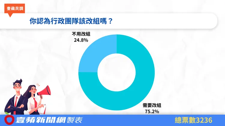 投票也詢問網友,「你認為行政團隊該改組嗎?」共有3,236名網友參加投票,其中75.2%、2404名網友傾向卓榮泰內閣需要改組;也有24.8%、794名網友則認為卓榮泰內閣不需要改組。