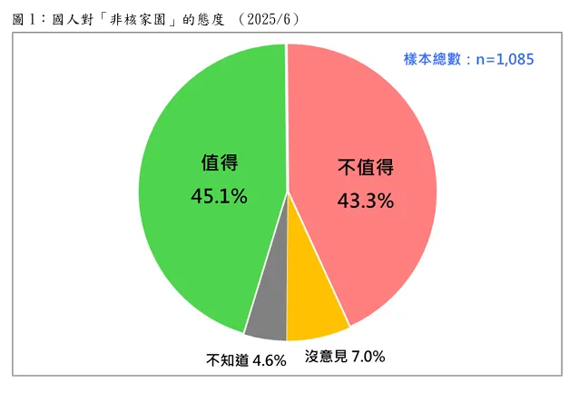 該民調詢問,自今年5月17日核三廠2號機除役後,台灣正式進入「非核家園」時代(也就是「零核電時代」),一般說來,您認為「非核家園」是不是一個值得追求的目標?結果發現有17.9%非常值得,27.2%還算值得,19.6%不太值得,23.7%一點也不值得,7%沒意見,4.6%不知道。換句話說,最新民意顯示,二十歲以上台灣人,45%認為「非核家園」是一個值得追求的目標,43%認為不值得。