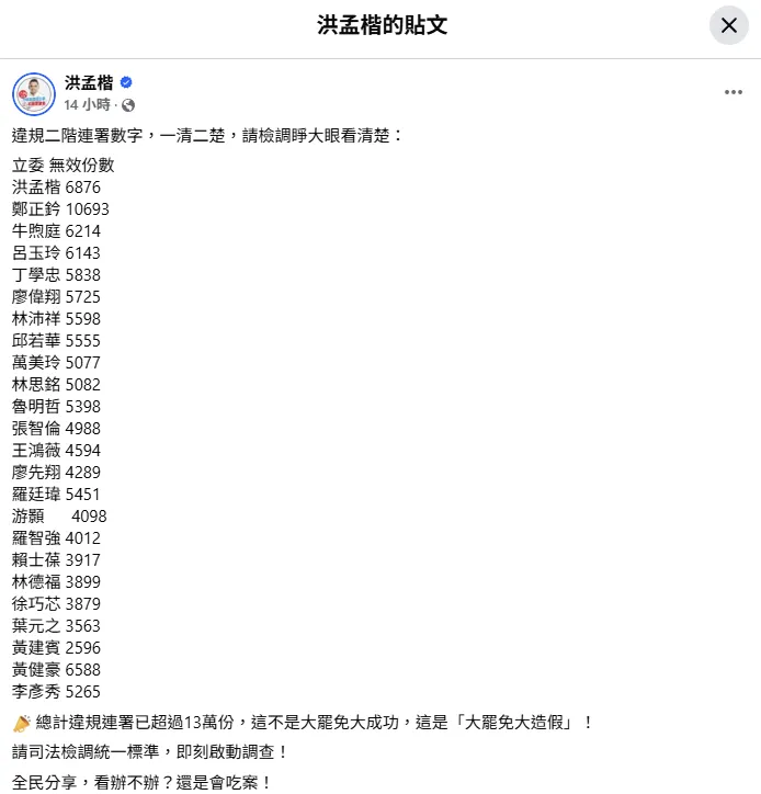 藍委洪孟楷痛批,這不是大罷免大成功,這是「大罷免大造假」。