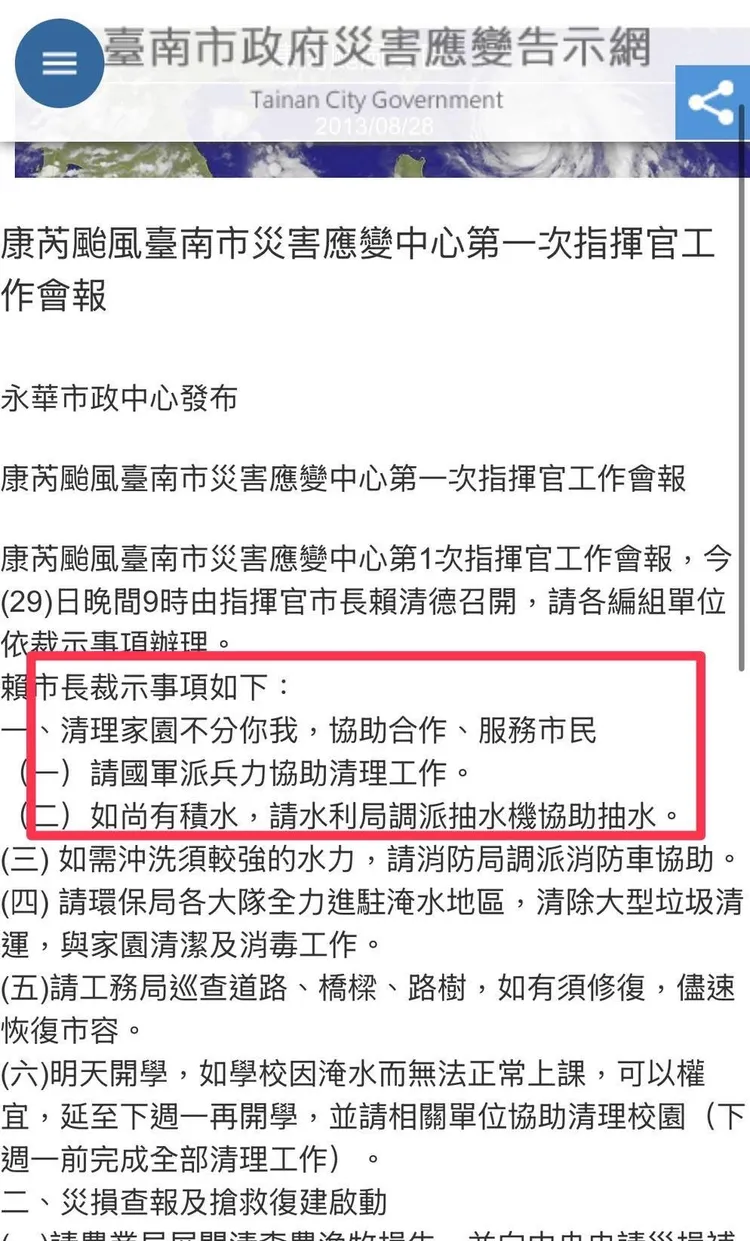 吳宗憲指出,2013年時,台南市長賴清德針對康芮颱風以地方指揮官身份下令:清理家園不分你我,協助合作、服務市民,請國軍派兵力協助清理工作。