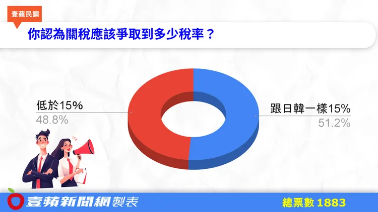 而當進一步詢問讀者,「你認為關稅應該爭取到多少稅率?」結果則有1883人參與投票,其中,有964人(51.2%)讀者傾向「跟日韓一樣15%」;但也有919人(48.8%)的讀者表態應「低於15%」。
