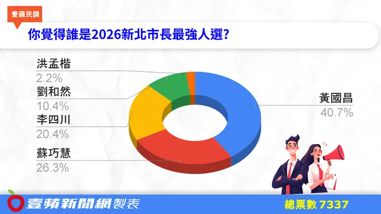 而當進一步詢問讀者,「你覺得誰是2026新北市長最強人選?」結果則顯示,有2989人(40.7%)讀者表態支持「黃國昌」;但也有1932人(26.3%)的讀者表態支持民進黨立委「蘇巧慧」;另有1495人(20.4%)的讀者願意支持「李四川」;還有760人(10.4%)支持新北副市長劉和然;立委洪孟楷則有161人(2.2%)。