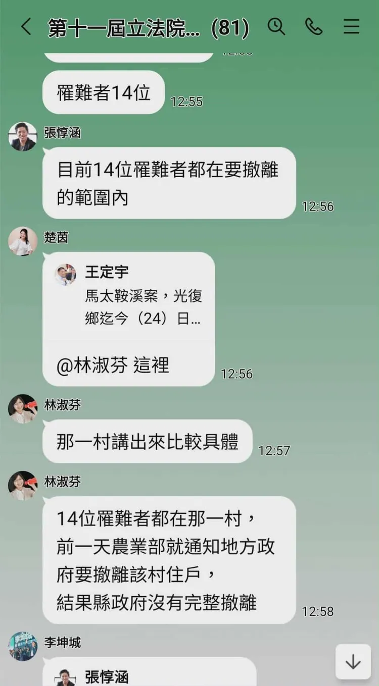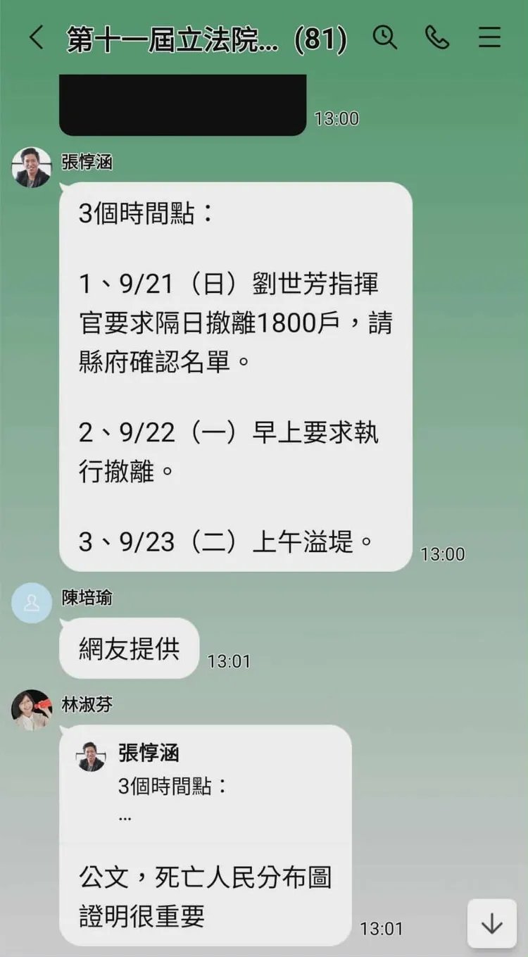 另外,截圖內容則指出,民進黨立委蔡易餘在群組回應,「人民現在不想到中央和地方在人命關天還在互打,也許我們展現聖母病一點,用責備語氣念自己人怎麼通報應該撤離不多次一點……」。