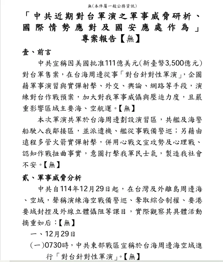 另外,國防部近來同步全面收緊資訊與文書管理規範,已下達新令,明定自民國115年1月1日起,正式推動「機密資訊精準標示」相關作業,凡是部隊所產制的任何資料、資訊,都要標註機密屬性,細至一文中各段落都要標註;而本次公開的國防部書面報告也不例外,各段文末都被標註【無】,以示無涉密。