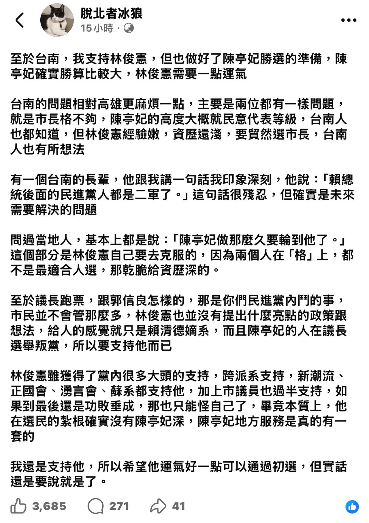 民進黨今稍早宣布台南市長初選民調將於晚間6時至10時30分進行,若有效樣本數達1200份,預計最早明日上午公布初選結果。不過民調尚未開始,知名的台派粉專「脫北者冰狼」卻發文向支持者表示「我支持林俊憲,但也做好了陳亭妃勝選的準備」,甚至坦言「陳亭妃確實勝算比較大」,而林俊憲則是「需要運氣」。
