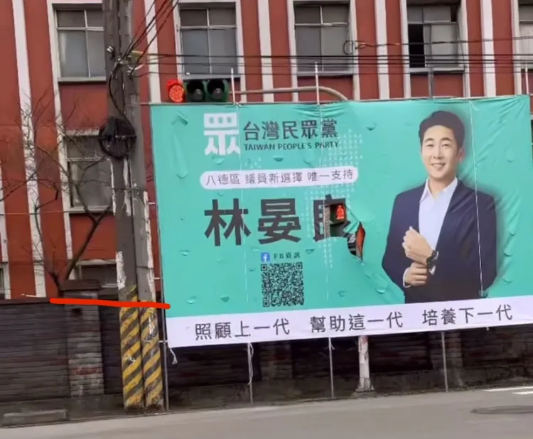 林晏良的看板上寫著「照顧上一代、幫助這一代、培養下一代」的口號,沒想到卻因遮擋交通號誌、危及用路人安全而引發大量負評,選戰還沒正式進入白熱化階段,就先踩到了公共安全的大地雷。