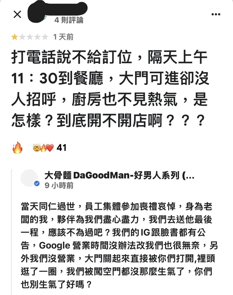 業者指出,被留負評那天因同仁過世,員工集體參加喪禮哀悼。「身為老闆的我,夥伴為我們盡心盡力,我們去送他最後一程,應該不為過吧?」