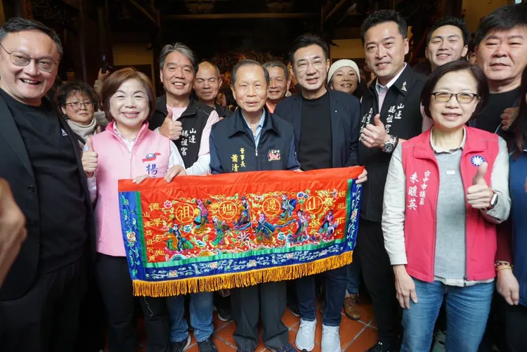 苗栗後龍山邊媽祖到台中贊境賜福,上午從南屯萬和宮出發,江啟臣、楊瓊瓔均到場參與,2人雖同框並先後致詞,但沒有多餘互動。