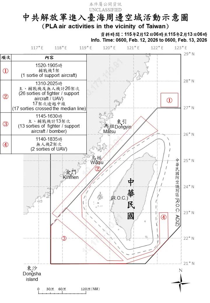 國軍於昨天下午1時10分至昨天晚間8時25分,在台灣海峽空域偵獲中共26架次主、輔戰機及無人機,其中17架次逾越海峽中線。