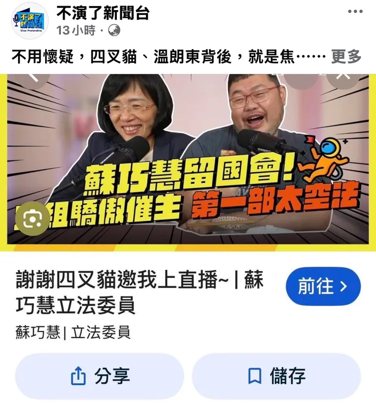 該粉專在貼文中指出,蘇巧慧表面維持溫和形象,實際上與被外界歸類為側翼意見領袖的四叉貓等人互動頻繁,藉由討論對手相關舊案製造議題聲量。貼文並指稱,此類操作恐引發部分選民反感。