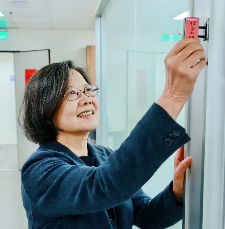 蔡英文還替愛犬「樂樂」搭配萌虎新朋友,並在辦公室房門旁掛上「福氣加碼」小燈箱,同時也準備一個送給陳三歲,分享新春祝福。