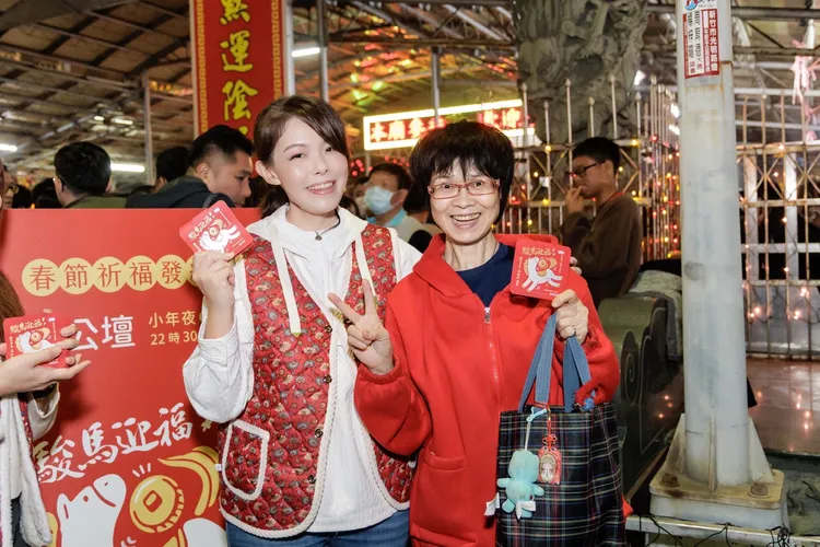 高虹安晚間前往新竹天公壇參拜祈福,並親手發送馬年「駿馬迎福」開運小紅包,向排隊等候的民眾逐一拜年。不少市民驚喜表示,「市長這套穿搭太有創意了!」還有人笑說「根本年度最佳新春造型」。