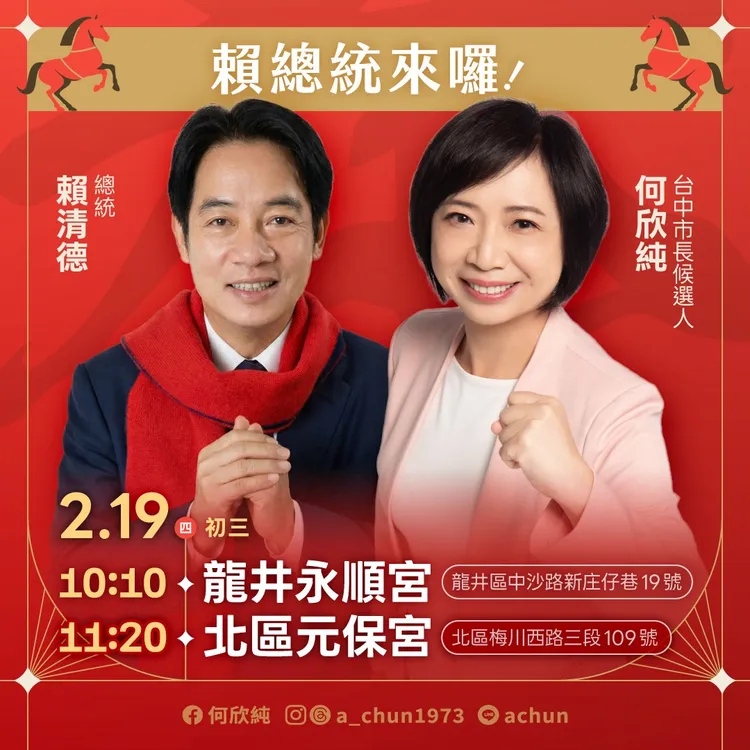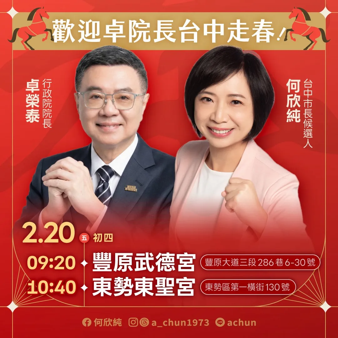 另外,何欣純17日大年初一將陪同副總統蕭美琴至霧峰南天宮、大雅永興宮拜年;19日初三陪同總統賴清德至龍井永順宮、北區元保宮拜年;20日初四陪同行政院長卓榮泰至豐原武德宮、東勢東聖宮拜年。