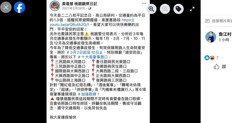 詹江村並貼出黃瓊慧2021年2月28日的臉書貼文截圖,指出當時她尚未擔任議員,內容提醒民眾注意連假交通車潮,並寫下「希望大家快快樂樂出門」等字句,與今年批評追思活動的立場形成對比。他質疑此舉是「蹭流量」,甚至形容為「選票的力量」。