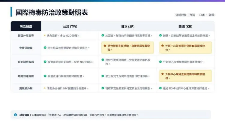 韓國則進一步設置「外展中心」,除了常態性提供保險套及相關防護用品外,也提供即時性病篩檢服務,讓民眾能更方便地接受檢驗,降低篩檢門檻,也提升及早發現、及早治療的機會。