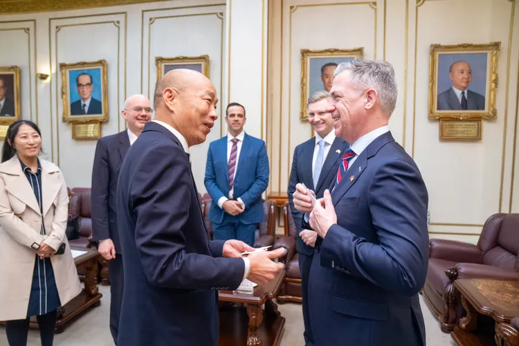 韓國瑜首先歡迎訪團蒞臨,並逐一介紹今日一同出席之跨黨派委員,韓國瑜比喻,立法院跨黨派生態猶如不等邊三角形,其中民眾黨佔有8席的關鍵少數,但立法院無論黨派,都非常重視國家安全。