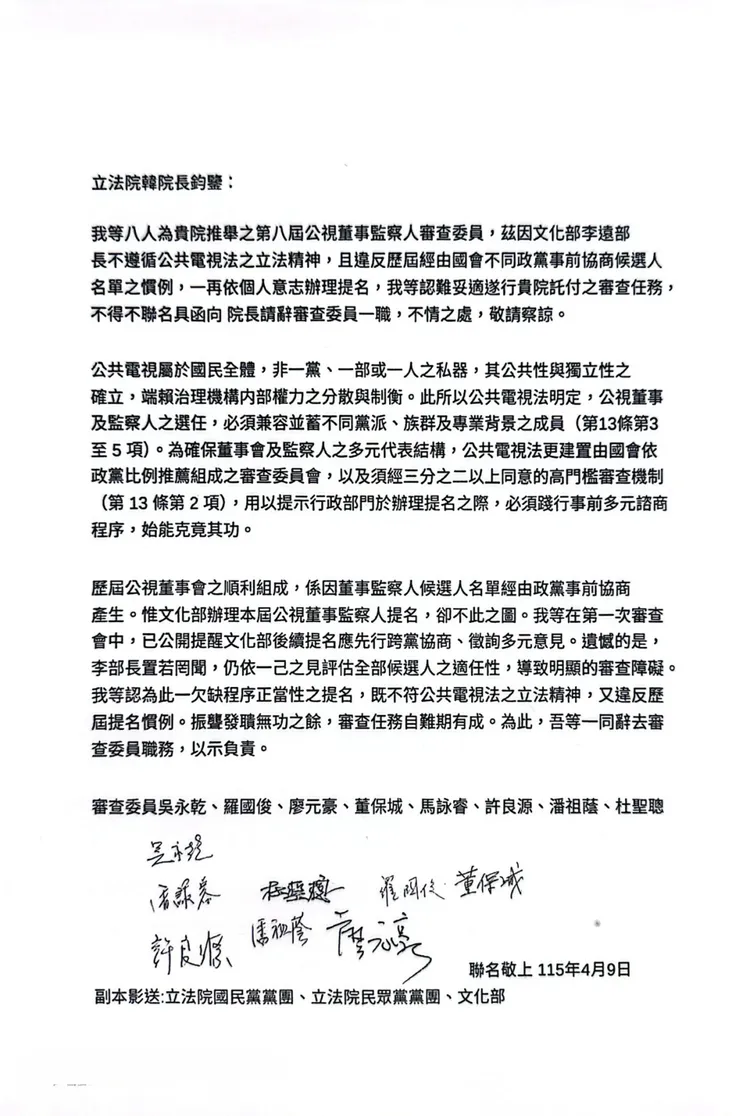我等八人為貴院推舉之第八屆公視董事監察人審查委員,茲因文化部李遠部長不遵循公共電視法之立法精神,且違反歷屆經由國會不同政黨事前協商候選人名單之慣例,一再依個人意志辦理提名,我等認難妥適遂行貴院託付之審查任務,不得不聯名具函向院長請辭審查委員一職,不情之處,敬請察諒。