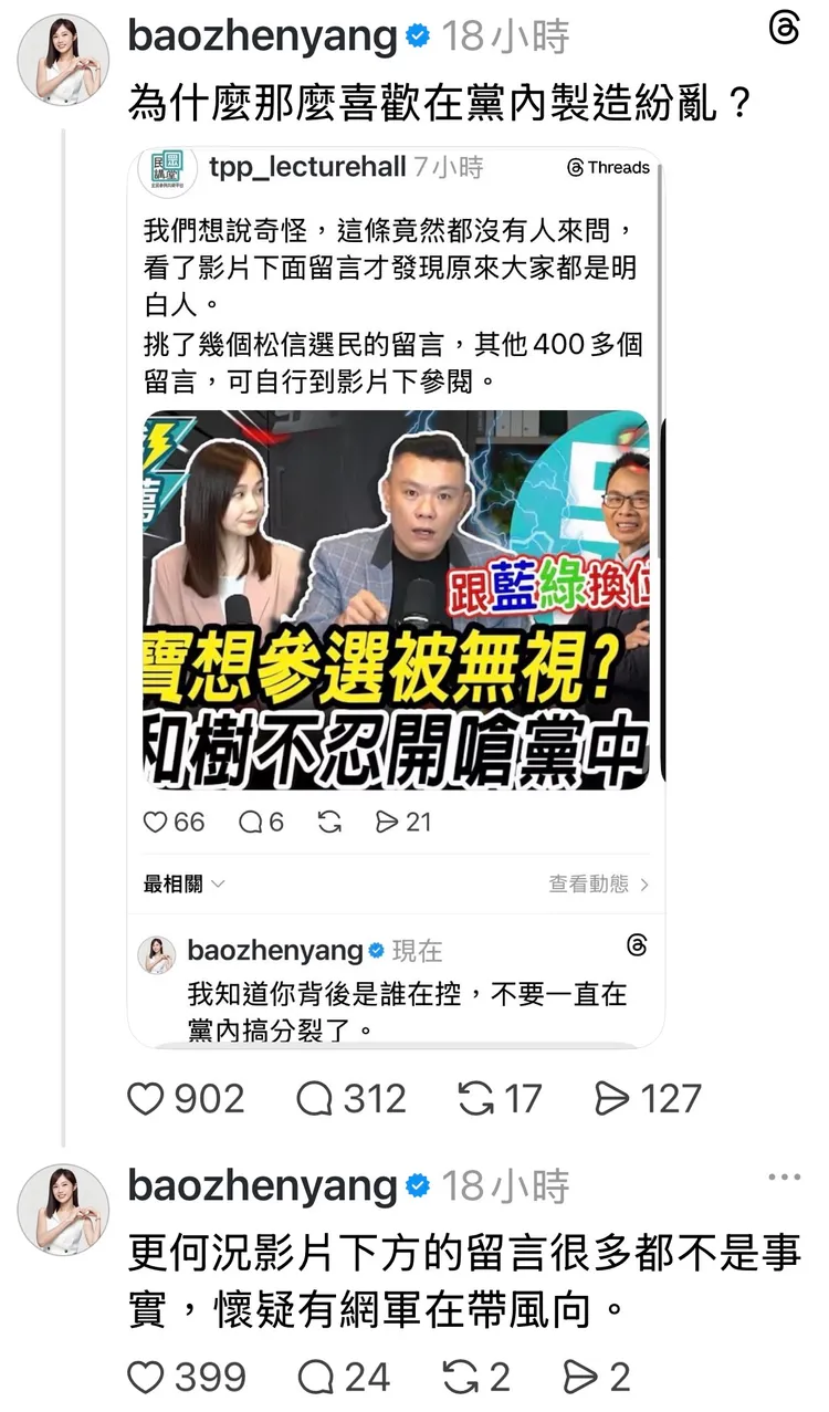楊寶楨則在下方留言「我知道你背後是誰在控,不要一直在黨內搞分裂了」,並懷疑這些網友留言有網軍在帶風向,引發雙方支持者論戰。