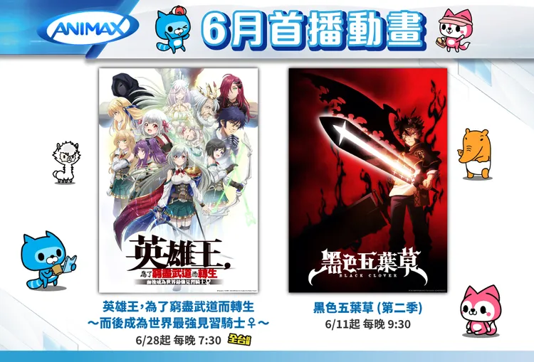 炎炎夏日來襲,就用熱血的心準備迎接夏天的到來吧!Animax頻道將於6月播出《英雄王,為了窮盡武道而轉生~而後成為世界最強見習騎士♀~》及《黑色五葉草 (第二季)》,不管男女老少、不管是不是英雄,都要勇於追夢,熱血戰鬥起來!