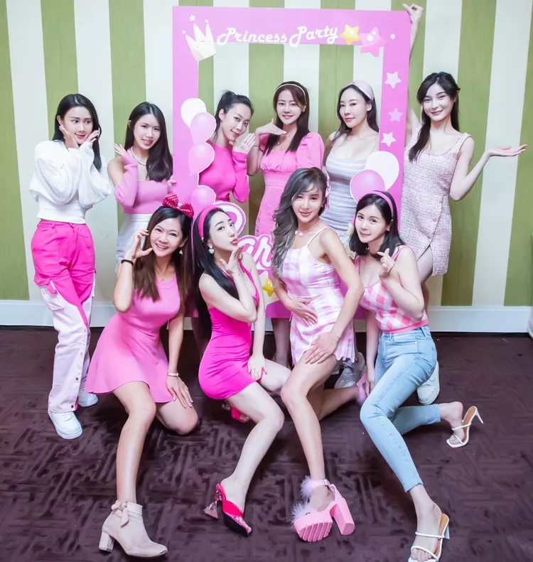美女主播劉盈盈、購物主持人李雅楹、網紅VK、外科醫生Angel等12位美女,精心裝扮芭比Barbie齊聚一堂,名媛王子苓特地買了和電影女主角芭比一樣的粉紅格子洋裝和帽子,也搭配穿上今年流行的粉紅毛毛高跟鞋。
