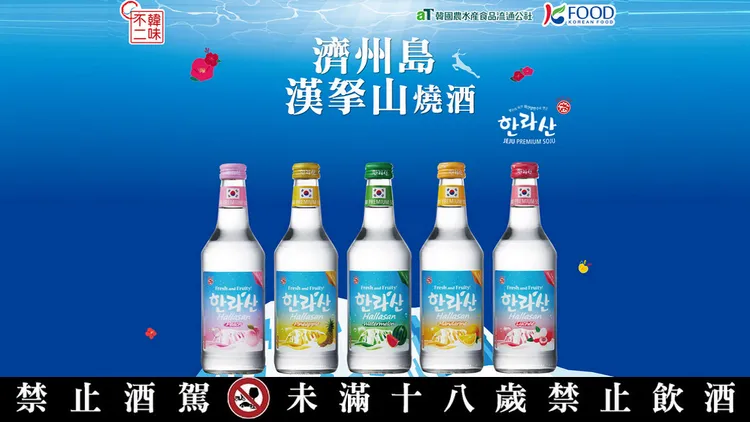 濟州島漢拏山燒酒帶來兩種不同酒精度數的系列商品,分別是風味更為深沉的漢拏山21%,以及添加了華箬竹葉茶浸出液的漢拏山16%,兩款燒酒都是口感柔和,尾韻乾淨的優秀之作,除此之外,還有在台灣首次登場的濟州島限定,漢拏山水果燒酒,一共有鳳梨、西瓜、水蜜桃、柑橘及荔枝五種口味。讓大家能夠盡情享受來自濟州島的山水之味。