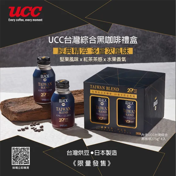 即日起「UCC BLACK台灣綜合黑咖啡20週年限量典藏禮盒」將於7-Eleven、MOMO購物、新光超市、CITY SUPER、大潤發、愛買等通路陸續上市,一組內含 UCC BLACK台灣綜合黑咖啡 275公克/瓶 4入,建議售價 599元/組,限量發售,售完為止。適逢耶誕佳節與新年節慶,精緻高雅的設計與高品質的黑咖啡更是送禮的好選擇。