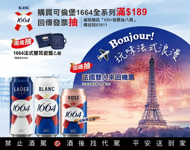 活動方式:只要於指定超商、量販及超市購買可倫堡1664全品項商品憑單筆發票折扣滿$189,編寫簡訊「KR+發票後八碼」傳送到83811,傳送成功即可參加週週抽「1664法式雙耳瓷盤」,加碼再抽「法國雙人來回機票」!